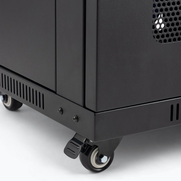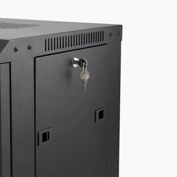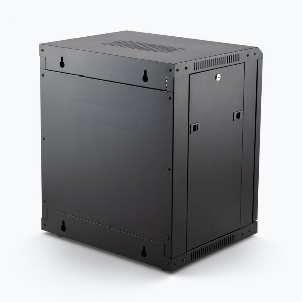 Protect and organize your rack-mount components by mounting them in the sturdy RKD1200 12U Wall-Mount Knock-Down Rack. The built-in rails accept standard #10-32 rack screws and there's room inside for 12U of standard 19-inch audio rack gear. This enclosed rack cabinet not only keeps gear safely inside but it also keeps unwanted intruders out. And that's not the only way it safeguards your gear. Eight vents on the top, front, and sides promote proper airflow to ensure that your equipment doesn't overheat. A lockable front door and two lockable removable panels on the sides enable you to easily access the front and rear of your devices to run cables and adjust settings. The side panels feature spring-loaded releases that hold them in place, leaving it up to you whether you'd like to lock them or not. For ease of setup and installation, the rear panel is also removable via four screws. Perforated port knockouts on the top and rear panels let you decide how many openings you need for your particular cable and antenna system. If you don't knock them out, they'll remain closed for maximum equipment enclosure. Keyhole hangers on the rear panel enable stable mounting of the rack on a wall, perfect for commercial sound installations, conference rooms, and recording studios. Optional feet are included if you wish to place the rack on a desk, workstation, or shelf. Or, if you find that you need to move your rack frequently, optional casters can be purchased separately. When the rack is parked for storage, presentations, performance, or recording, locks on the casters keep it firmly and safely in place. The case is constructed of steel for strength and stability to ensure reliable support for your equipment. Durably finished in classic black, the rack looks great, resists chips and scratches, and blends into your conference, livestream, stage, or studio setup to add to a professional presentation.