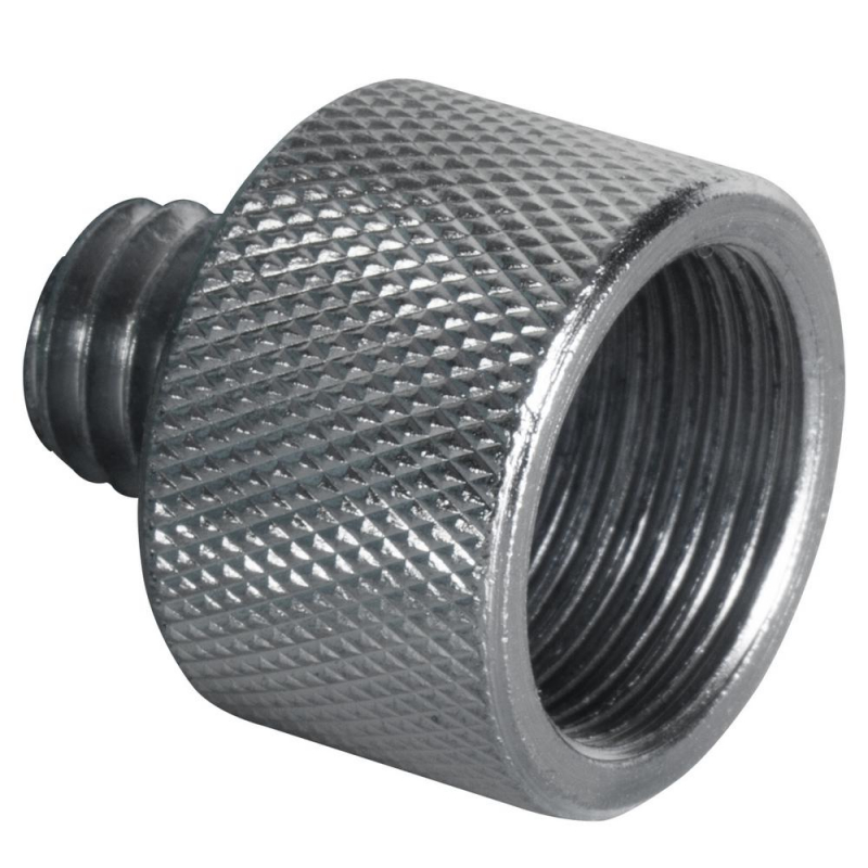 Now your standard mic stand can be a versatile tool that uses any European boom arm or mic accessory you choose. Our MA-100 3/8" Male to 5/8" Female Mic Screw Adapter quickly and easily allows European booms and accessories to fit standard stands. This adapter features a knurled outer flange for ease of tightening and loosening. Chrome finish.