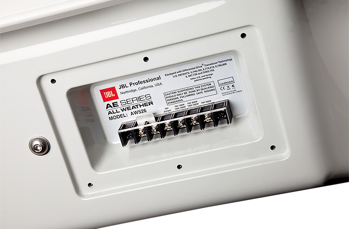The AW595 is a high power, lightweight, 2-way, full-range loudspeaker system comprised of the JBL Differential Drive dual voice coil and dual magnetic gap 2265H-1 380 mm (15 in) low-frequency driver and 2432H high-frequency 38 mm (1.5 in) exit, 75 mm (3 in) voice-coil compression driver. The large format Progressive Transition wave-guide provides excellent 90° x 50° coverage. The waveguide is rotatable so the loudspeaker system can used in either the vertical or horizontal orientation. The system is equipped with a 400 W 70/100V transformer. A heavy-duty stainless steel U-type mounting bracket is included and allows for easy installation on flat surfaces or in 90° corners. The enclosure is constructed of multilayer glass composite and is heavily braced to maximize lowfrequency performance. The 14-gauge stainless steel grille, backed with open cell foam and stainless steel mesh, provides excellent protection in the harshest environments. The AW595 is part of JBL’s AE Series, a versatile family of loudspeakers intended for a wide variety of applications. |