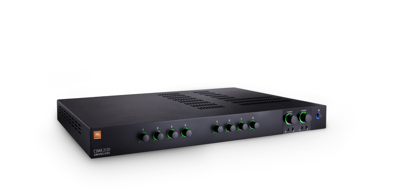 The amplifier, capable of driving both eight and four Ohm loads, can be used with 70V and 100V distributed audio systems without the need for a separate transformer. On its back panel you'll find euroblock connections for mic/line inputs, as well as unbalanced RCA inputs, speaker connections, dip switches for input routing, and more. The unit is also equipped with two RJ45 connectors for use with JBL CSR-V in-wall volume controls (available separately).