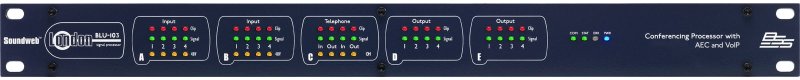 The Soundweb London BLU-103 offers a fixed configuration of 8 analog inputs and 8 analog outputs, a Voice over IP (VoIP) interface, configurable signal processing, AEC processing, and a high bandwidth, fault tolerant digital audio bus.