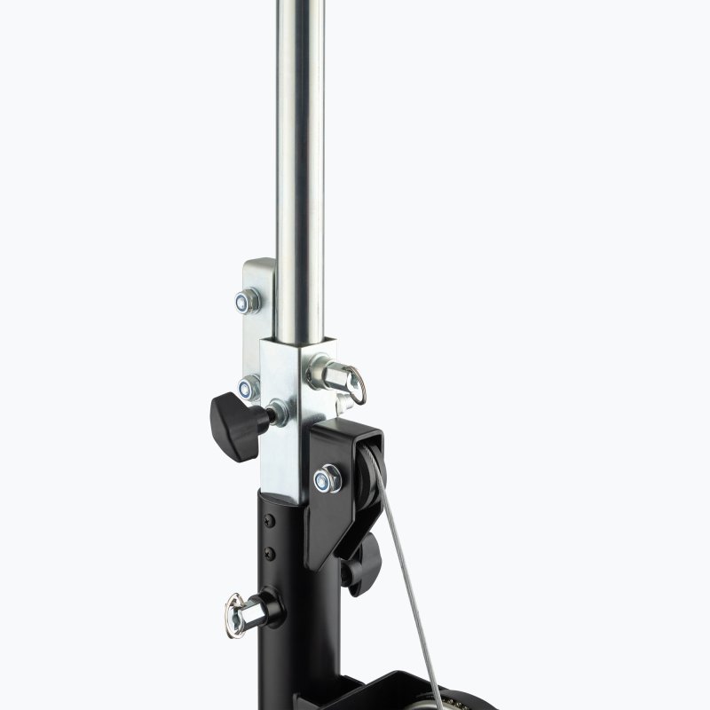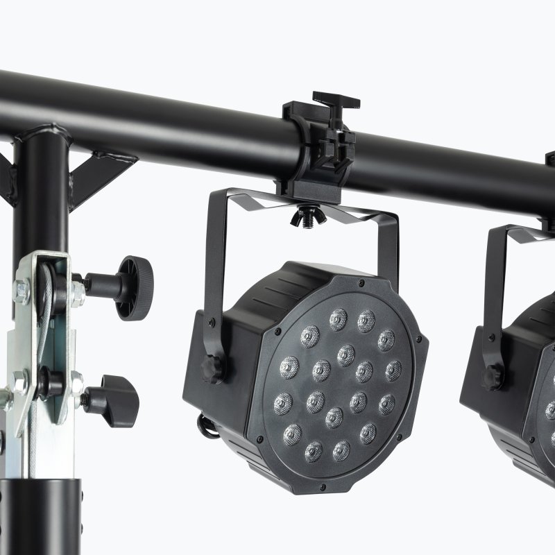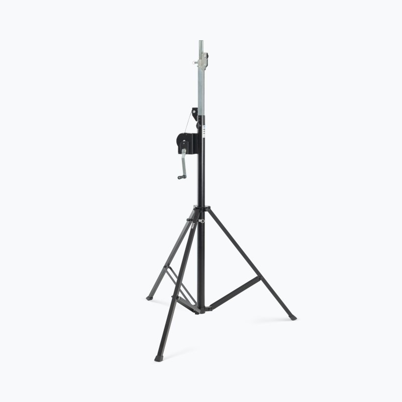 Give your lights a lift with the LS9900B Crank-Up Lighting Stand. This portable yet sturdy rig makes it easy to set up and tear down tall lighting and speaker configurations in theaters, outdoor venues, and other performance spaces. To accommodate a wide range of lighting effects, the stand adjusts in height and your settings are reinforced with the included locking pin to ensure safe, secure, reliable equipment support. The upper shaft can be completely extended to reach over 13 feet in height, for towering lighting. It can also be lowered to a minimum of just over six feet tall. For ergonomic setup and teardown, this stand raises and lowers the upper shaft via a hand-cranked ratcheting winch, making it much easier for you to fully elevate and safely lower your heavy equipment. At the top of the shaft a horizontal T-bar holds your light fixtures with four available mounting spaces that accept PAR cans, LEDs, spots, lasers, projectors, moving heads, and other effects. Upper shaft enables you to mount lights weighing up to 185 pounds. With its lengthy legs, the braced tripod base is a solid foundation, providing outstanding stability and load balance to ensure safe, reliable support for your overhead equipment. Moreover, nonslip rubber feet absorb vibrations and prevent slides and skids to firmly keep the stand where you want it. The stand is constructed of steel for strength and stability to ensure reliable support for your equipment. Durably finished in classic black and plain steel, the stand looks great, resists chips and scratches, and blends into your livestream, stage, or studio setup to add to a professional presentation. For compact storage, efficient transportation, and ease of load in and load out, the T-bar can be detached and the tripod base folds down.