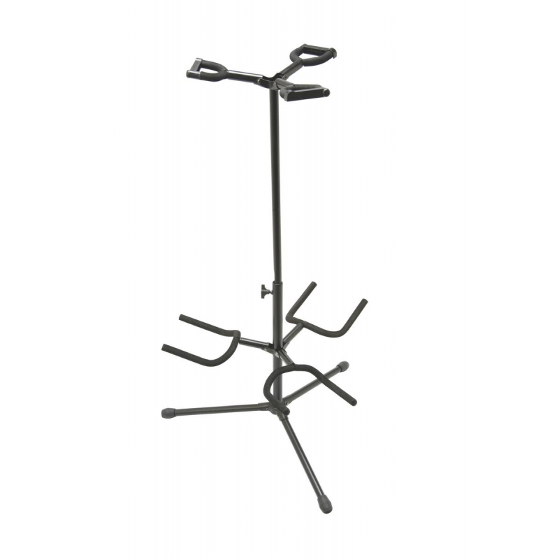Our GS7321BT Deluxe Folding Triple Guitar Stand provides easy access to two guitars while storing them safely. The height-adjustable upper yoke shaft and two-point lower yokes fit any traditionally shaped guitar including acoustic, electric, and bass as well as mandolins and banjos. Padding on the yokes protects the instrument finishes and a security latch on the upper yokes prevents the instruments from being bumped off the stand. A wide tripod base provides stability and balance for dependable instrument support. For efficient storage and transportation, the base and all six yokes fold down. |