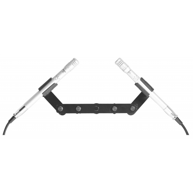 Our MY700 Deluxe Stereo Mic Bar mounts to a mic stand and holds up to six mic clips simultaneously, eliminating the need for multiple floor stands. Three pairs of threaded stems are located equidistantly from center for convenient stereo miking. The horizontal angle of the outermost stems adjusts for versatile mic placement.