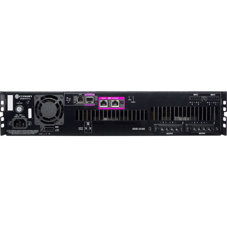 The integrated DSP provides a comprehensive set of tools and features including LevelMAX limiting for inputs and outputs with thermal limiting, input compression, input & output delay (up to 2 seconds), input & output EQ, crossover settings, and a signal generator. The Crown DCi 4/300DA DriveCore Install DA Series 4-Channel Amplifier ships with four input connectors and a power cord. |