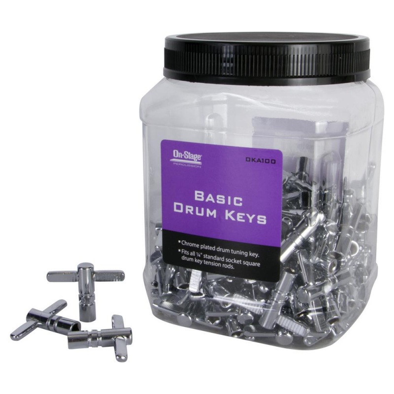 This DKA100 Drum Key P.O.P. Container contains 100 industry-standard drum tuning keys. These drum keys fit all standard 0.25" square-lug drum tension rods. The clear plastic container is a convenient point-of-purchase display for essential accessories.