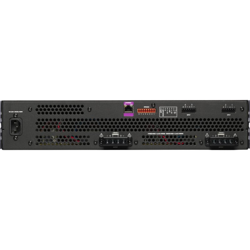 The amplifier features a remarkable 96 kHz/32-bit digital signal processing with delay, 8-band parametric EQ, crossovers, FIR processing, LevelMAX limiting, and more. The integrated DriveCore technology incorporates hundreds of amplifier components into a single chip for superior efficiency and reliability. With its updated design, the LA4 allows for high power output at 2 ohms, enabling up to four surround speakers to be powered by a single channel. There are built-in cinema speaker tuning presets that match all JBL cinema loudspeakers for optimal performance, protection, and easy deployment.