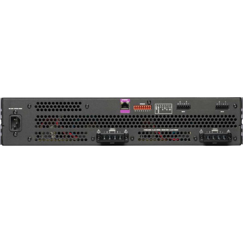 The font panel features an LCD and encoder to configure amplifier settings and mute channels at the touch of a button. The rear panel provides four analog inputs via two Euroblock connectors and two terminal strip speaker outputs to connect up to four speakers. A HiQnet (RJ45) port allows the amplifier to connect with HARMON Audio Architect control software over a standard TCP/IP network. A GPIO/AUX port allows you to externally recall presets, mute channels, monitor amplifier health and power the amplifier on or off.