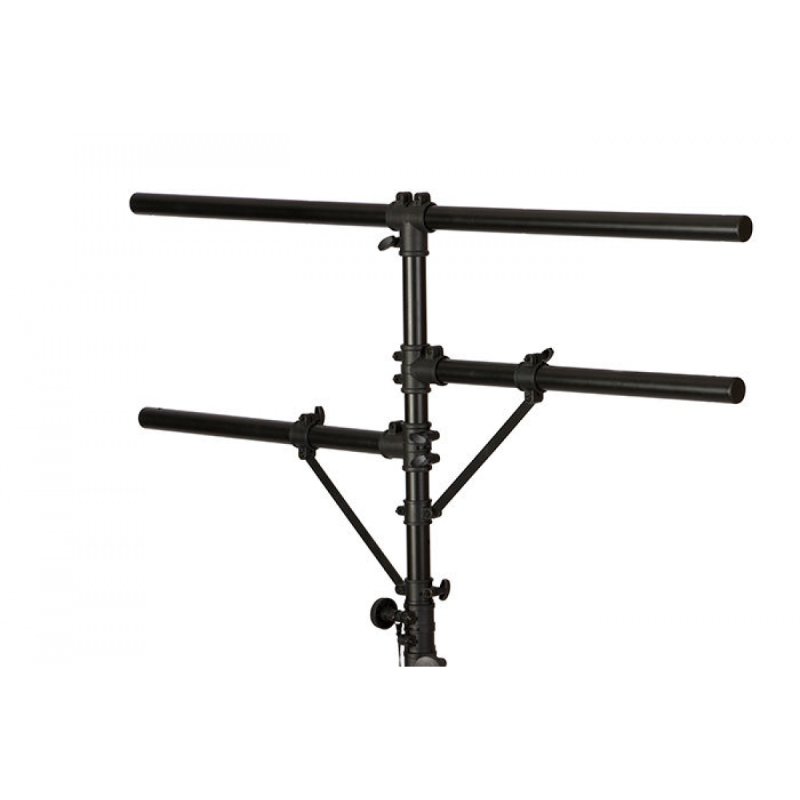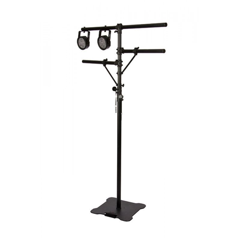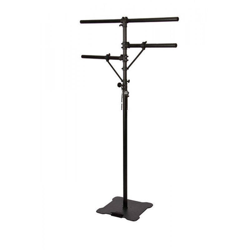 An efficient, secure way to erect and dismantle portable lighting, our LS7920BLT Lighting Stand features three mounting bars and a height-adjustable shaft that extends up to 10', providing support for tall, complex lighting configurations. Perfect for use in tight spaces, the flat, heavy base maintains a low profile yet delivers exceptional balance and stability. The top T-bar mounts four PAR cans while the two side bars each mount two PAR cans, and hardware is included for mounting all eight fixtures. The integrated carrying handle on the base features a padded cover to facilitate ergonomic set up, teardown, and transportation. |