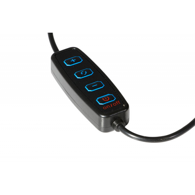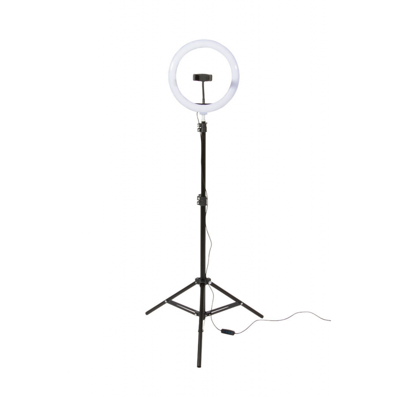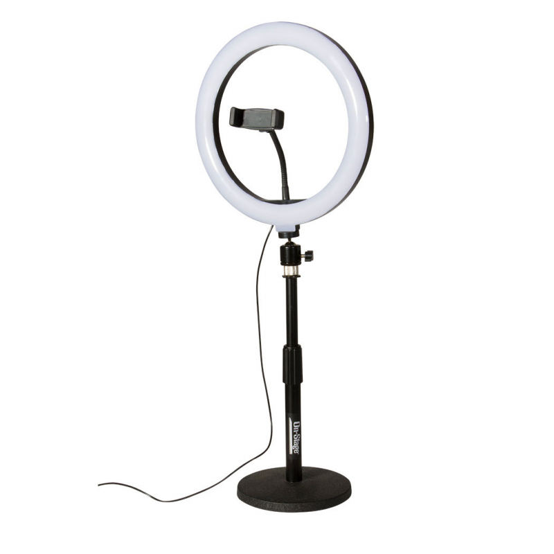 Enjoy bright, even lighting for your visual content with our VLD360 LED Ring Light Kit. Featuring three modes of color temperature- warm white, natural white, and cool white warm white-that each provide eight levels of brightness, the 10" ring light adapts to a wide range of lighting needs. The light's gooseneck phone holder rotates 360 degrees to enable camera use in portrait or landscape orientation and the light swivels 180 degrees for ease of finding the most flattering angle. A Bluetooth wireless remote shutter for iOS and Android devices controls the camera from up to 25' away, making it easy to produce content on your own. Two ring-light stands-one for desktops and one for use on the floor-each adjust in height for precise lighting of sitting or standing subjects.