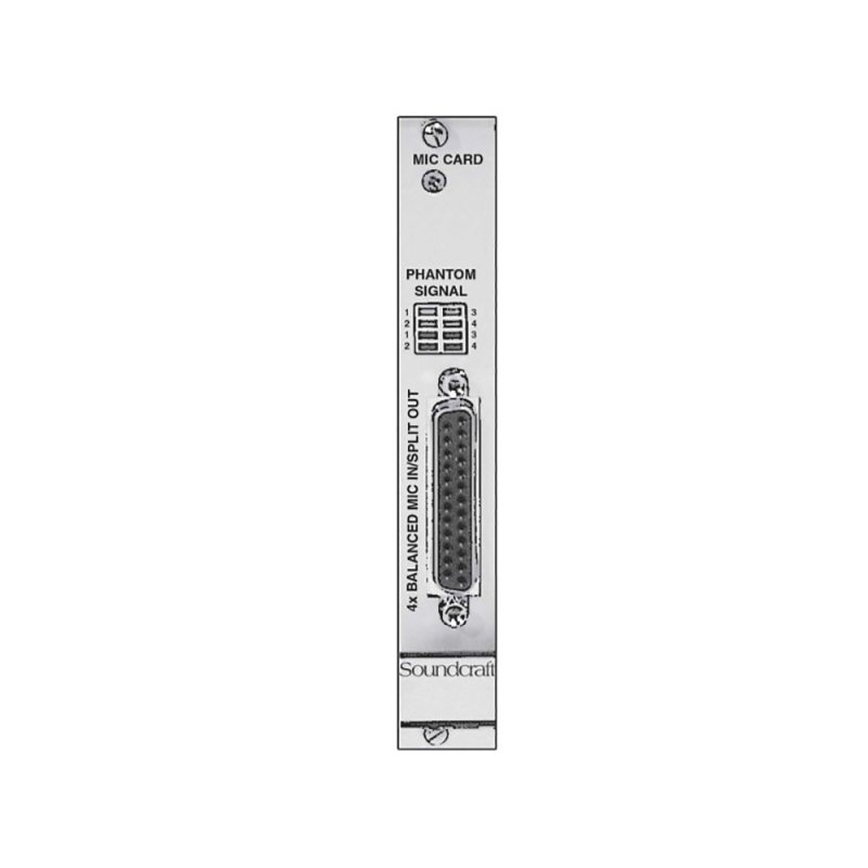 The Mic In card provides 8 channels of classic Soundcraft mic preamps with 10-65dB gain range, switchable 20dB PAD, 80 Hz high-pass filter and 48V phantom power with indicator LED. A transformer balanced version is available to special order.
