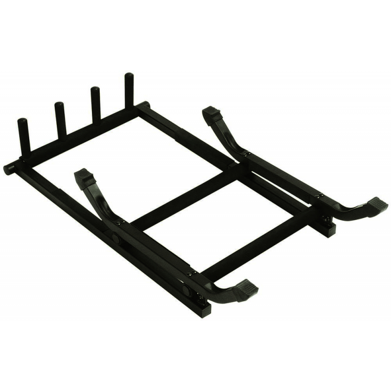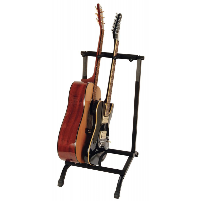 Great for gigs, our GS7361 Three-Space Foldable Multi-Guitar Rack provides all the benefits of a permanent guitar rack yet easily folds down for efficient storage and transportation. Up to three guitars are arranged single file for unobstructed access to each instrument. Dividers are included which can be added to the lower rails to ensure the guitar bodies don't bump into each other. All the guitar-resting points and dividers are padded to protect guitar finishes. The wide four-point base provides stability and balance for dependable instrument support. To keep up with ever-changing gear, this rack holds any of the following combinations of guitars: two acoustics and one electric, two electrics and one acoustic, or three electrics. |