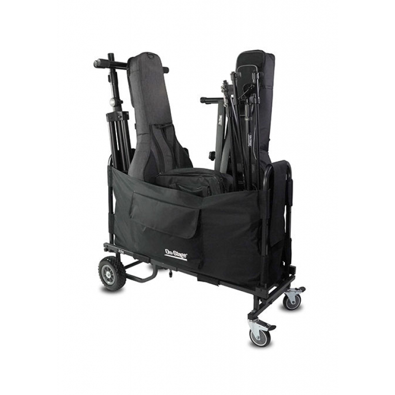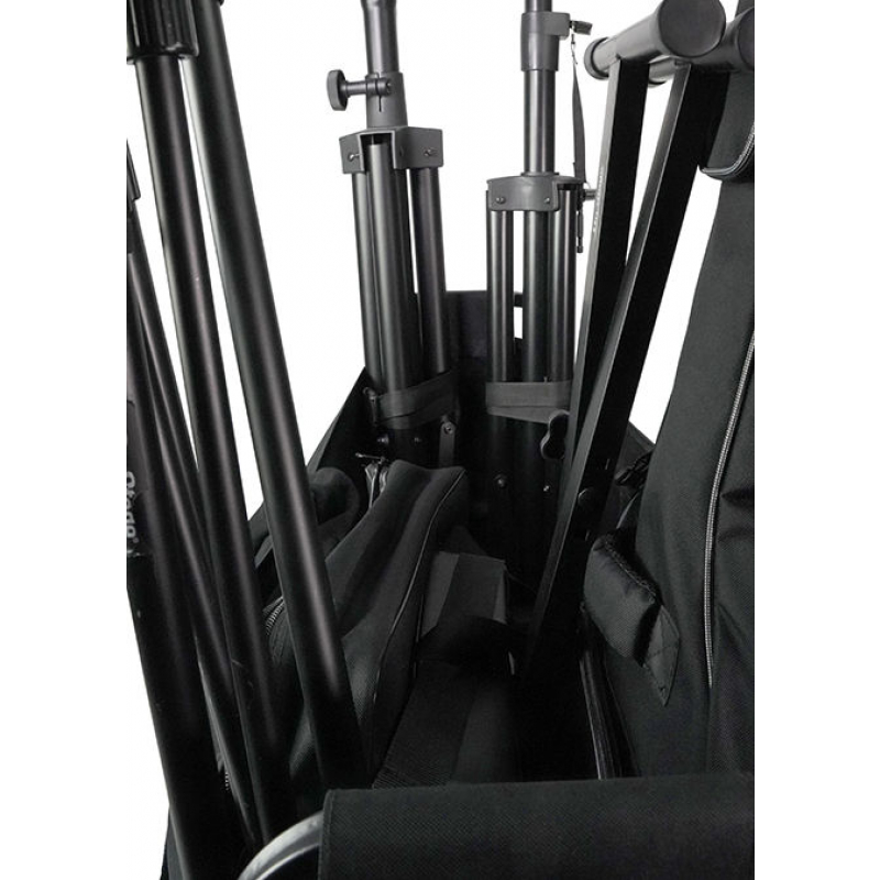 Increase the loading capacity of the UTC2200 or UTC5500 Utility Cart with the UCB2500 Cart Bag. The reinforced bottom provides a solid surface for placing amps and other gear while the sides enclose and stabilize non-stackable items such as drum hardware, enabling more equipment to be loaded at once. Corner straps save space by securely holding speaker, lighting, and mic stands in the upright position while exterior accessory pockets carry anything from cables to microphones or other small accessories. For safe transportation, hook-and-loop straps ensure the bag is safely attached to the cart frame. |